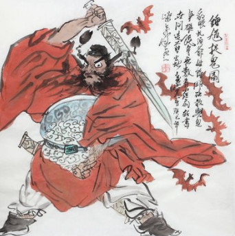 在我國江淮一帶地區(qū),曾有家家都懸鐘馗像,用以打鬼除祟、鎮(zhèn)宅驅(qū)邪的舊俗。這一習(xí)俗始自唐代。傳說唐玄宗自驪山講武回宮,瘧疾大發(fā),夢見二鬼,一大一小,小鬼穿大紅無襠褲,偷楊貴妃之香囊和明皇的玉笛,繞殿而跑。大鬼穿藍(lán)袍戴帽,捉住小鬼,挖掉其眼睛,一口吞下。玄宗問他是誰,大鬼自稱名鐘馗,生前曾應(yīng)武舉,不中,愿為皇上除天下妖魔。玄宗醒后,瘧疾痊愈,于是命著名畫家吳道子照夢中所見,畫成鐘馗捉鬼之圖像,通令天下于端午時(shí)張貼,以驅(qū)邪魔。